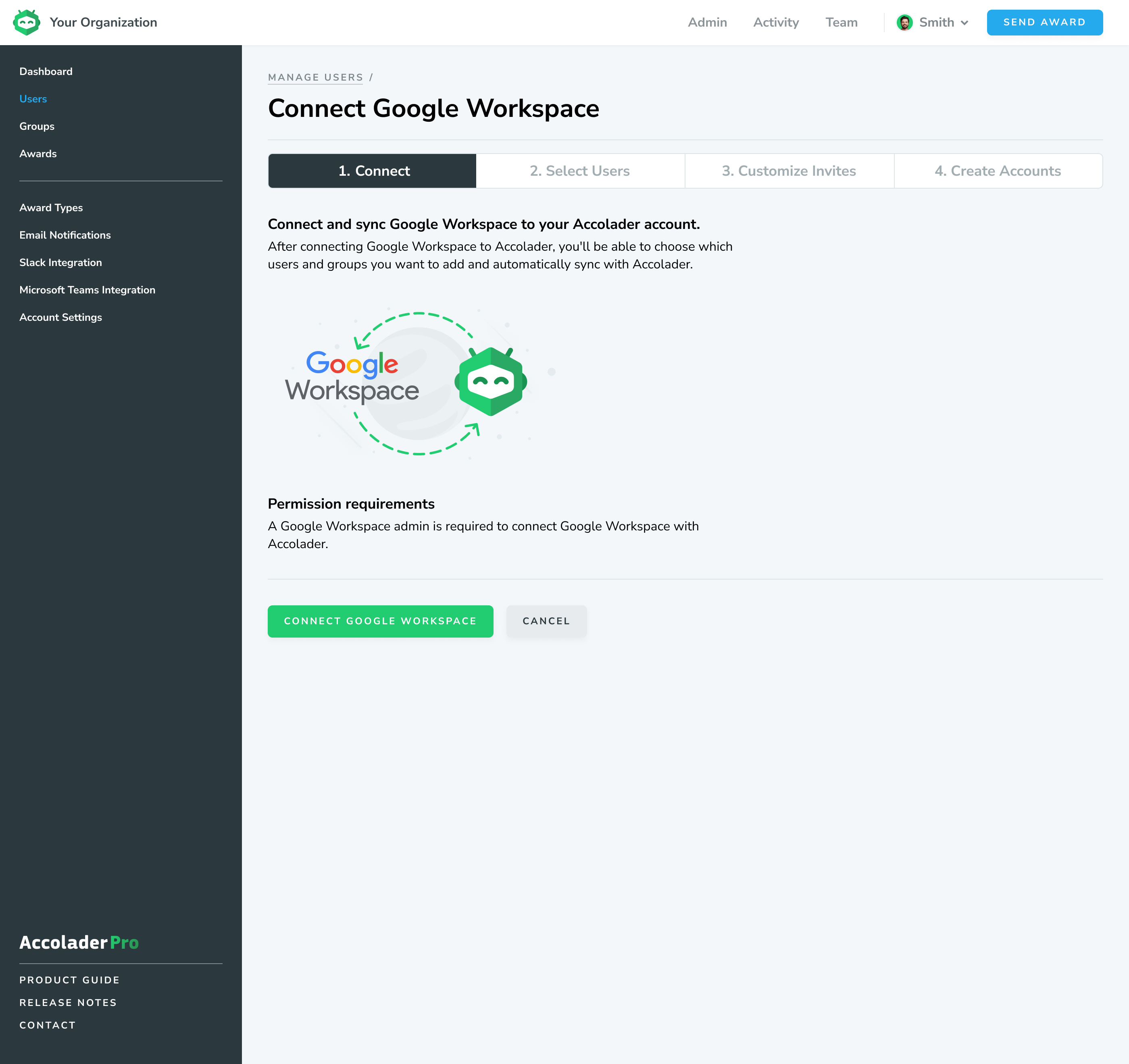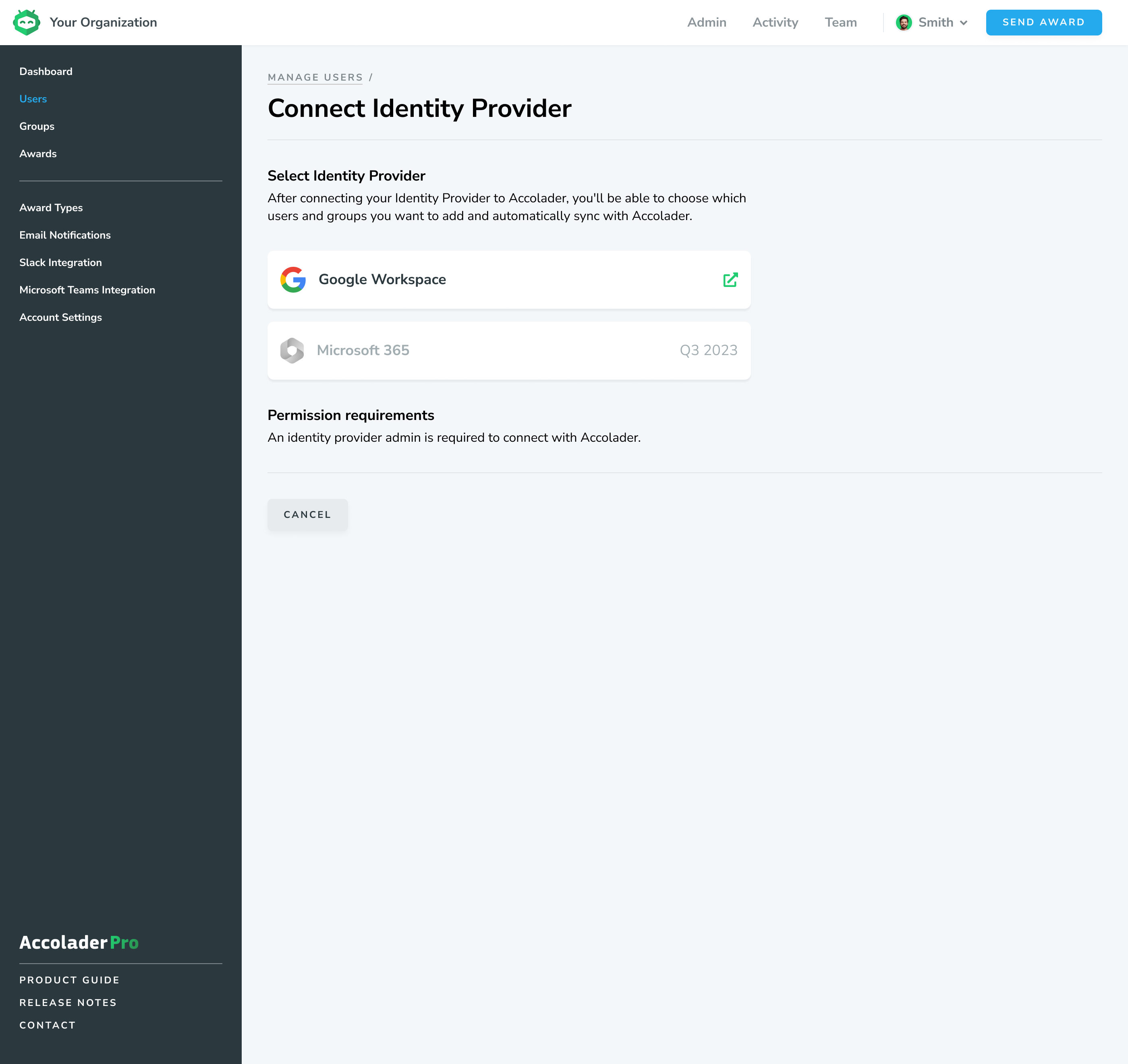 Google Workspace is a feature of Accolader Pro. To setup Google Workspace, click “Connect Identity Provider” under the “User” dashboard. This feature is only available to administrative users.