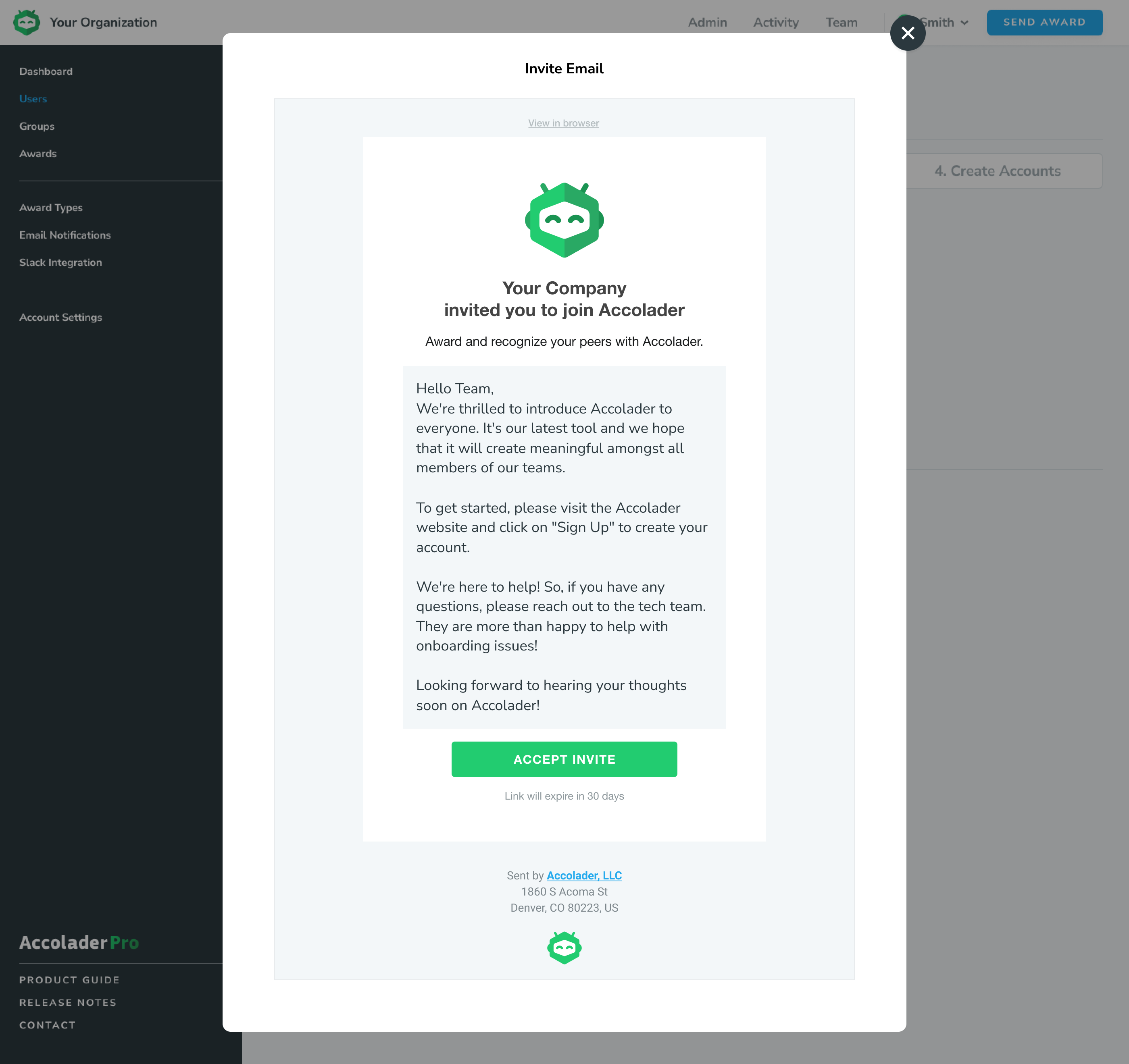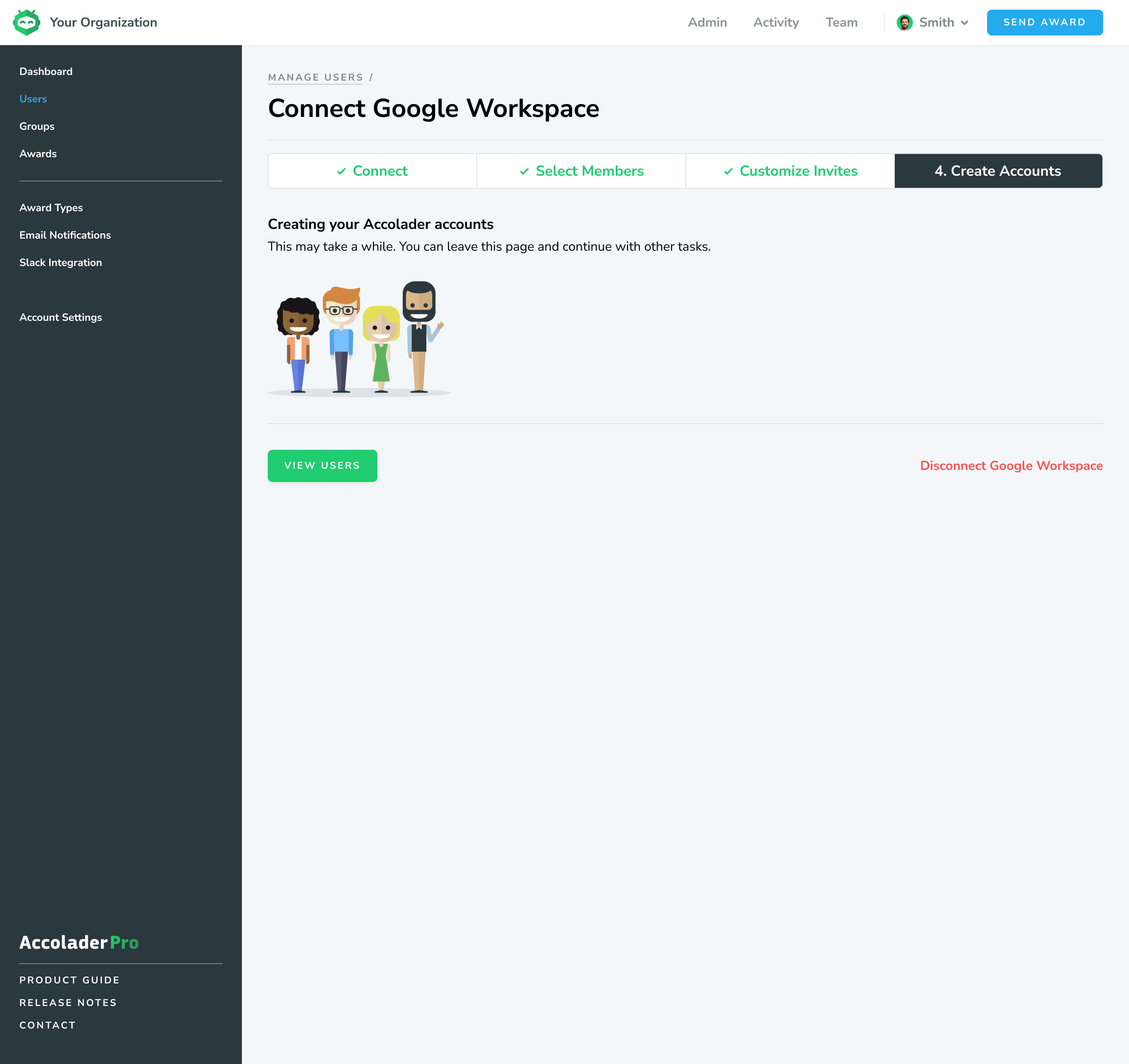 It will take a few minutes for your users to sync into the Accolader platform. Under “Users” on the left side of the dashboard, you can view the employees imported from Google Workspace.