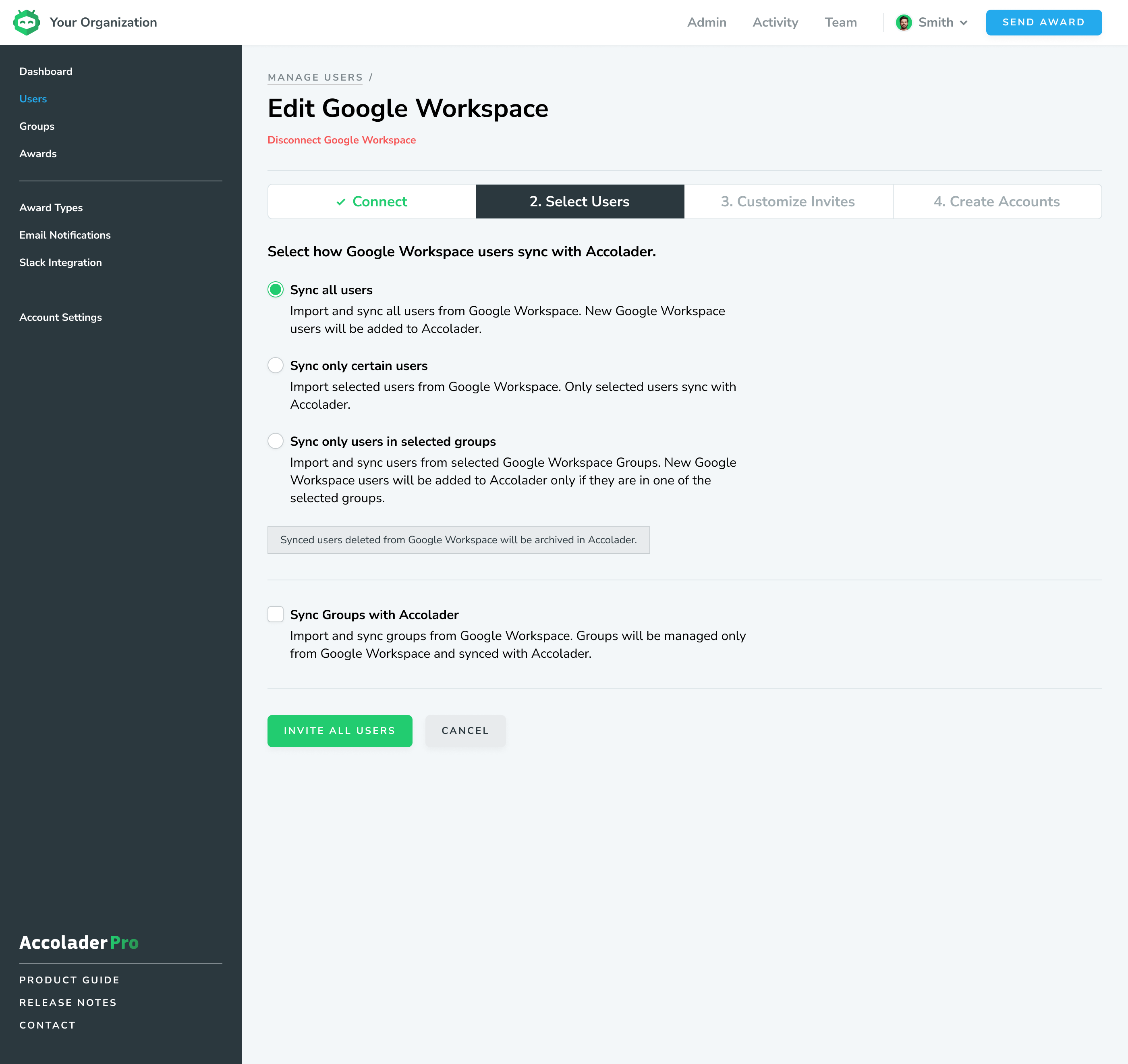 - Sync all Users -Import and sync all users from Google Workspace. New Google Workspace users will be added to Accolader.