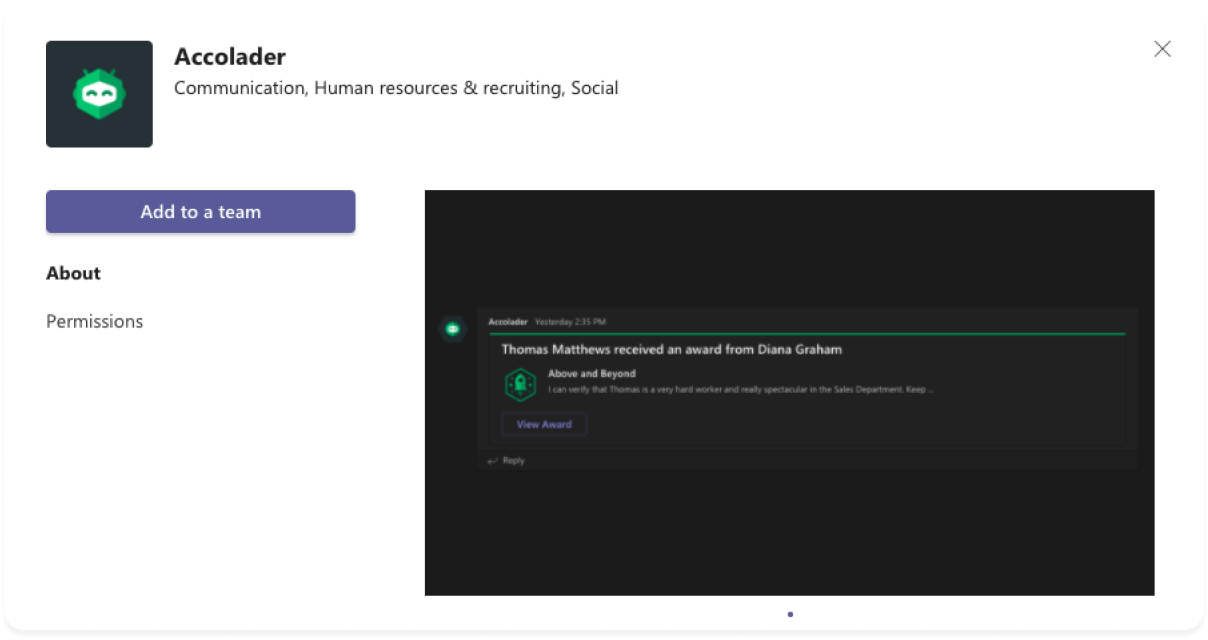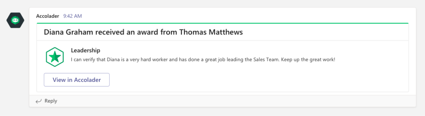 Microsoft Teams can now be connected to your Accolader account to instantly be notified about awards and endorsements.
