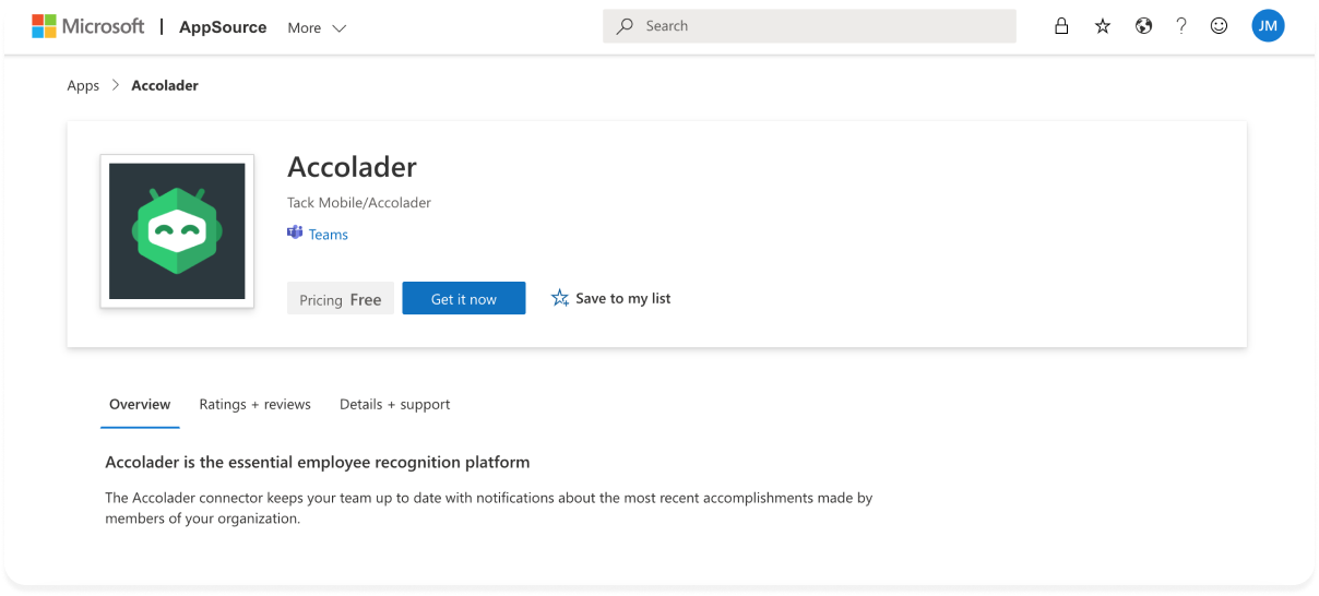 Accolader has a connector in AppSource that can be used to connect with Teams. Before you can set up Accolader with your Teams account, you must be an administrator in your organization’s Accolader account as well as your Team on Microsoft Teams to add the integration. There are two ways to add the Accolader integration: