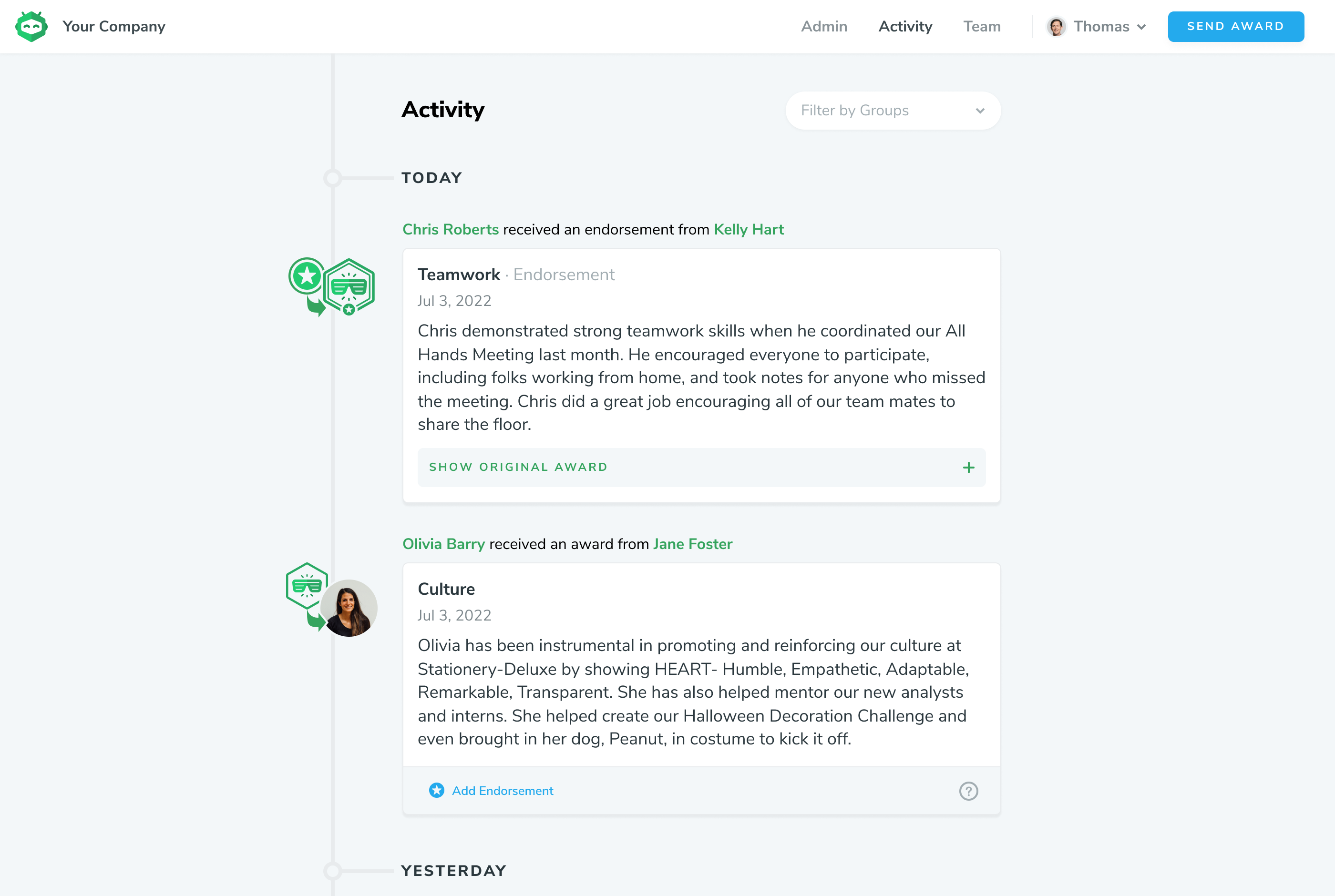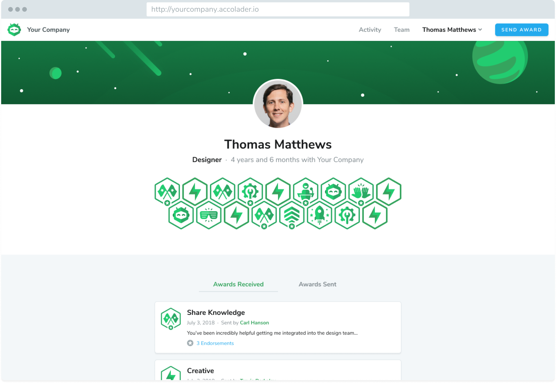 The Activity page is the default page when users log into Accolader. It shows recent awards sent and received, along with the most important part of any award: the description of what the achievement was that prompted the award.