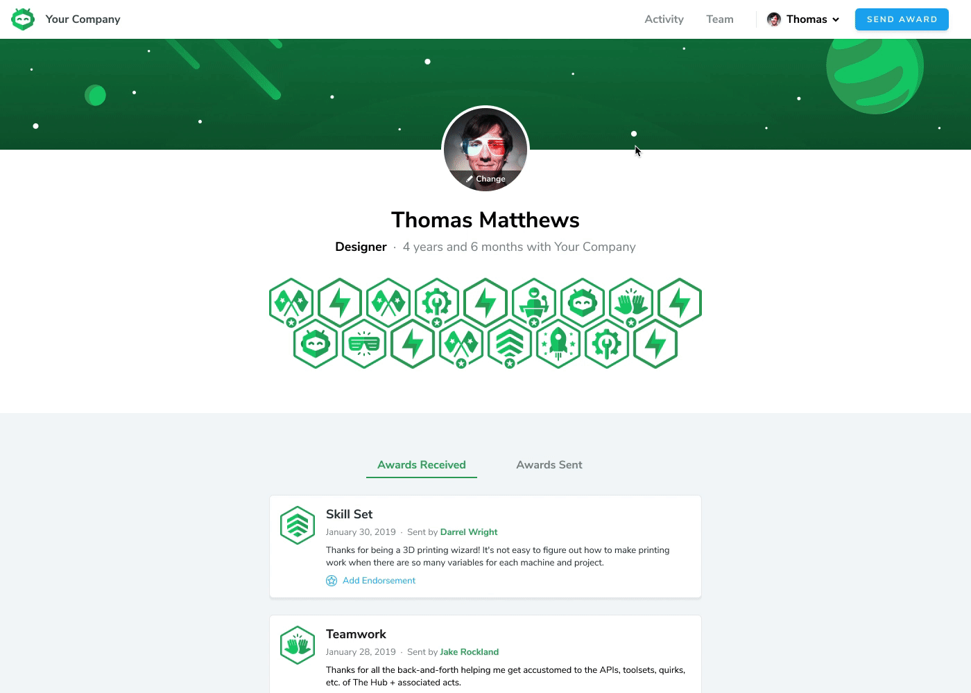 Each user has a page in Accolader showing their name, editable photo, and title. It also displays tenure, helpful to see over what period of time they have received their awards. Below, a summary of the awards they have received is presented in a grid, with each award type having its own unique icon type. The awards are listed below this grid along with most importantly the description of each award.