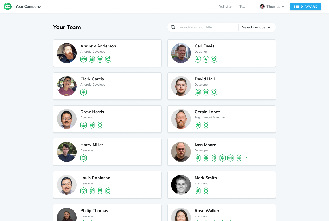 The team page shows every user who has been added to Accolader in your company or team. For larger teams, groups can be created by an administrator to make the number of users more manageable and easier to see. Multiple groups may be selected at once (for example, everyone in the “Denver” office and also all “Software Developers”). Groups are additive.