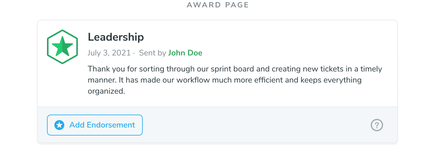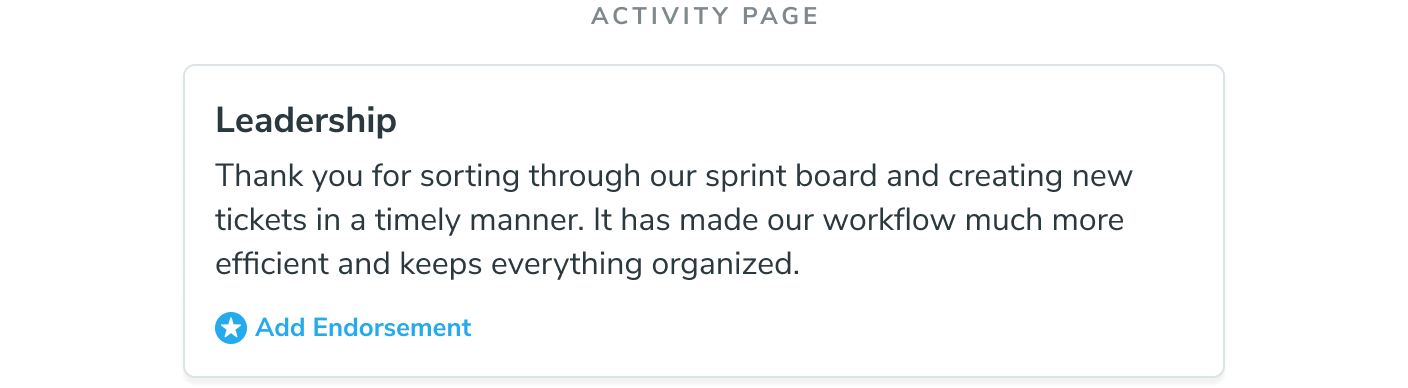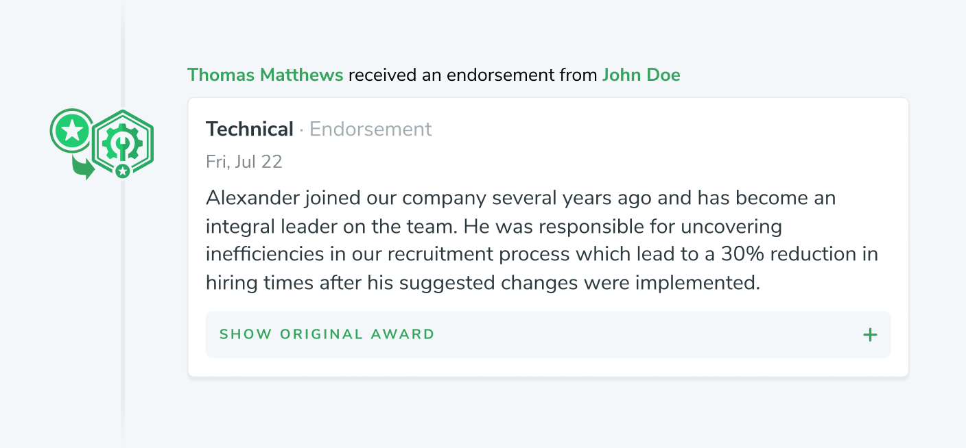 After an award is Endorsed, it will appear separately in the activity feed from the original award, along with the most important part of the endorsement, the description.