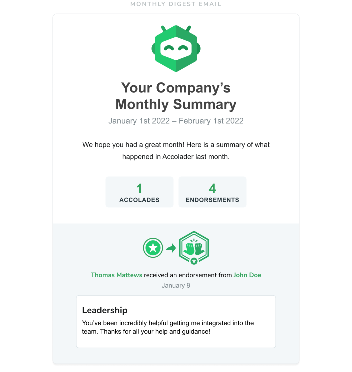 Endorsements will also show up in the monthly digest email and chat notifications, if your administrator has enabled those features.